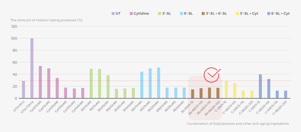 As the result of clinical test on Tyrosinase's activity per each ingredient, it was proved that Melanin pigments are produced under the permissible level when 3'SialyllactoseSL and 6'SialyllactosesSL are combined. GENERTE's products contain Sialyllactose 36SL™, providing anti-aging effects.