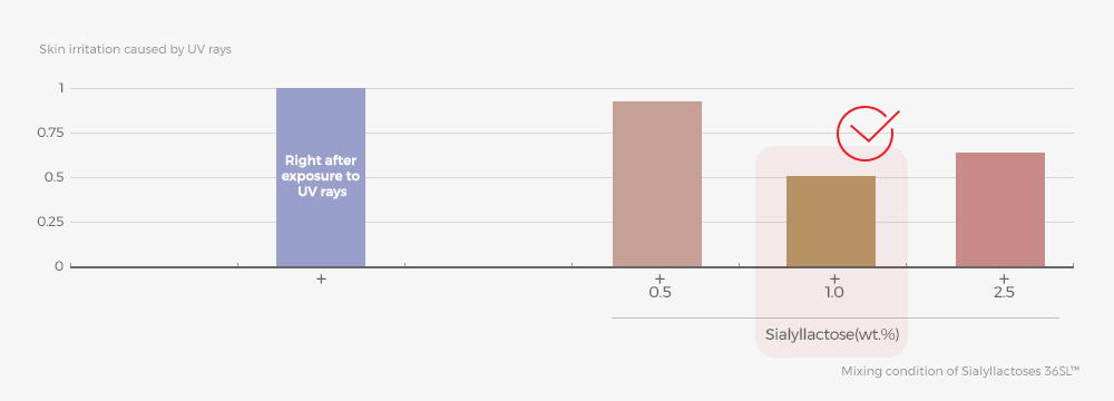 As a result of the clinical test on Sialyllacose36SL™ content, inflammatory response caused by UV light is reduced to the lowest level when 36SL™ level is 1.0%.